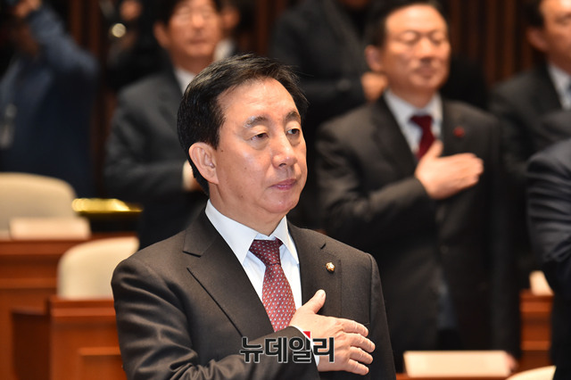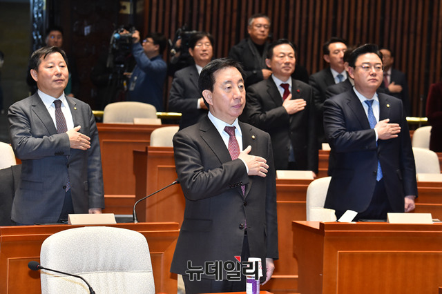 [포토] 국민의례하는 김성태 자유한국당 원내대표