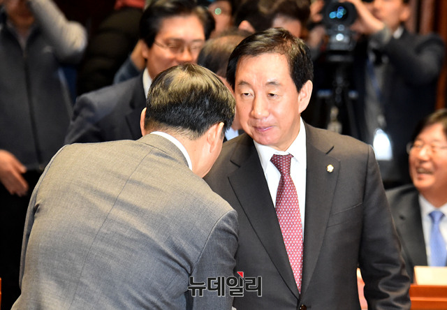 김성태 자유한국당 원내대표가 30일 오후 국회에서 열린 의원총회에서 참석자들과 인사를 나누고 있다.