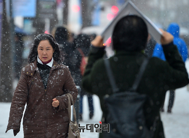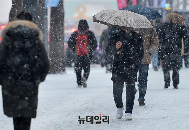 눈이 내리는 30일 오후 서울 중구 세종대로 일대에 사람들이 걸음을 재촉하고 있다.