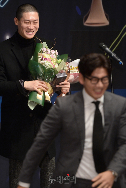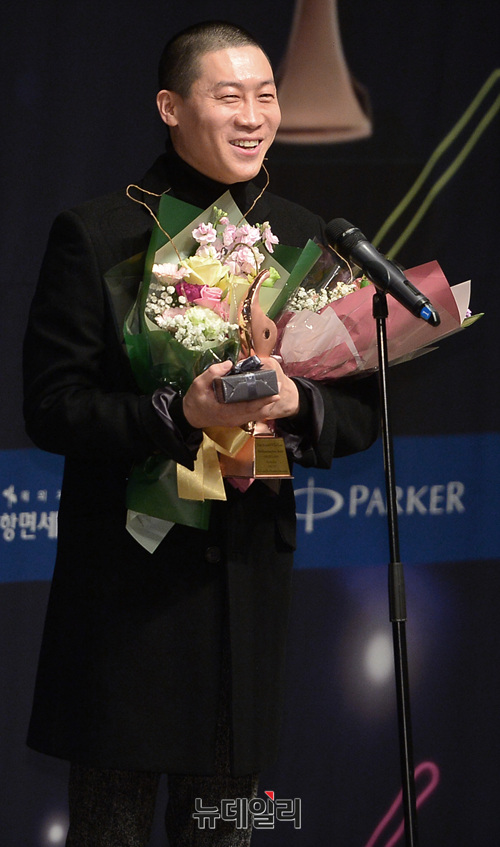 배우 진선규가 30일 오후 한국프레스센터에서 열린 '올해의영화상'에서 남우조연상 시상 후 소감을 밝히고 있다.