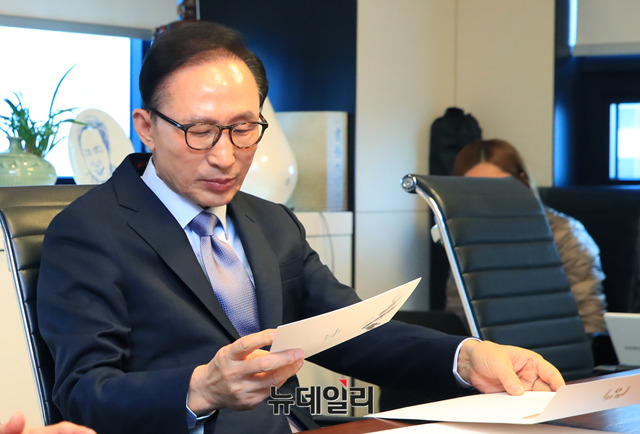 이명박 전 대통령이 31일 오후 서울 강남구 이 전 대통령의 사무실에서 한병도 청와대 정무수석에게 전달 받은 평창동계올림픽 초청장을 확인하고 있다.