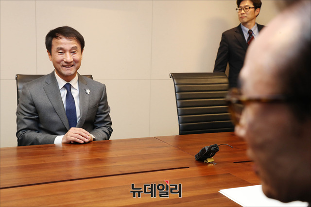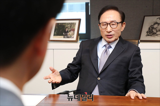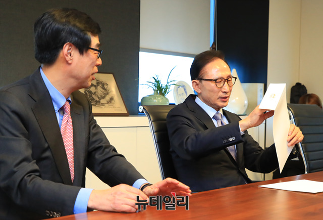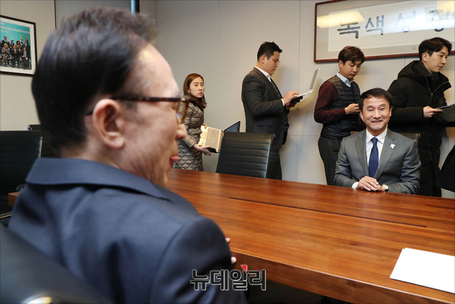 이명박 전 대통령이 31일 오후 서울 강남구 이 전 대통령의 사무실을 찾은 한병도 청와대 정무수석과 대화를 나누고 있다. 한 수석은 이날 이 전 대통령에게 평창동계올림픽 초청장을 전달했다.