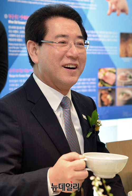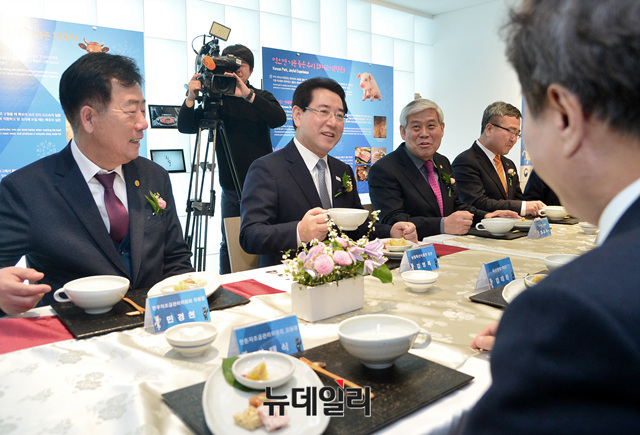 김영록 농림축산식품부장관이 31일 오후 서울 중구 한식문화관에서 열린 '2018 평창동계올림픽 선수촌 국산 식재료 공급 협약식'에 앞서 국산 재료로 만든 다과를 시식하고 있다.