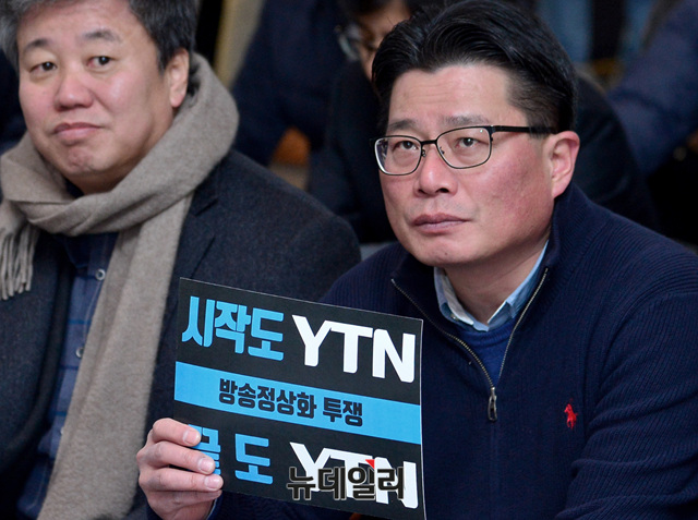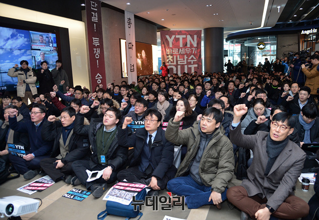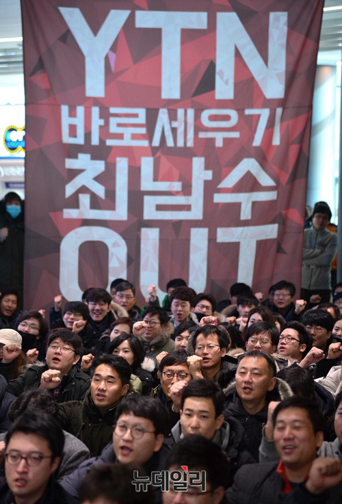 YTN노조가 1일 오전 서울 마포구 YTN사옥에서 최남수 사장 퇴진을 요구하는 파업 출정식을 하고 있다. 노조는 지난해 12월 취임한 최 사장이 노사합의를 파기했다고 주장하고 있다.
