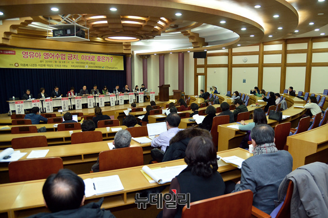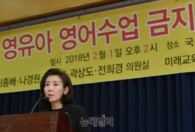 나경원 자유한국당 의원이 1일 오후 국회 의원회관에서 열린 '영유아 영어수업 금지, 이대로 좋은가?' 세미나에 참석해 인사말을 하고 있다.이날 토론회는 감경회 성신여대 교육학과 교수의 사회로 권지영 교육부 유아교육정책과장, 양정호 성균관대 교육학과 교수, 김종필 한국어린이집총연합회 보육정책연구소장이 각각 '문재인 정부 영유아 영어수업 금지정책 현황 및 과제', '유치원 영어수업 현황 및 과제', '어린이집 영어수업 현황 및 과제'를 주제로 발제를 맡았다.