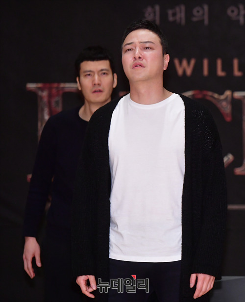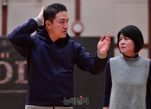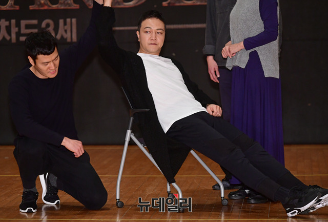 배우 정웅인이 1일 오후 서울 서초구 예술의전당에서 진행된 연극 '리차드3세' 연습실 공개행사에서 하이라이트 장면을 시연하고 있다.