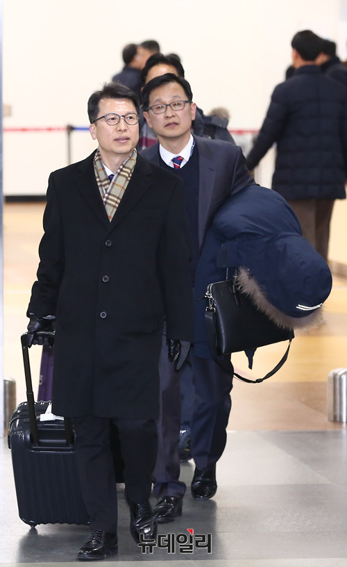 이주태 통일부 교류협력국장이 마식령스키장에서 남북 공동훈련을 마친 대한민국 선수단을 이끌고 1일 오후 강원도 양양공항을 통해 입국하고 있다. (사진=사진공동취재단)
