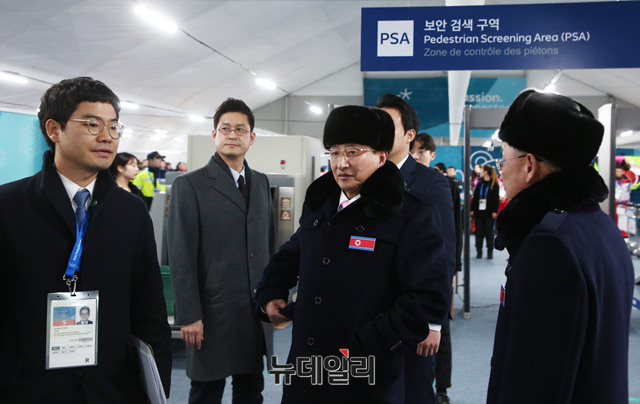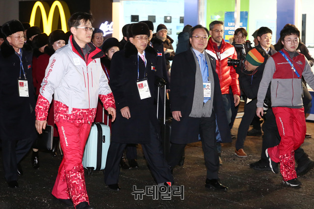 북한 원길우 체육성 부상과 선수단이 1일 오후 강원도 강릉 올림픽 선수촌에 입촌하고 있다. (사진=2018평창사진공동취재단)
