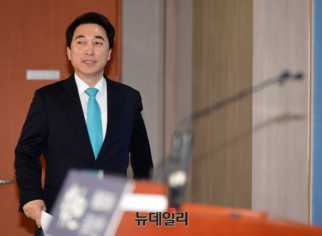 박수현 전 청와대대변인이 5일 오후 충남도지사 출마선언을 위해 기자회견장으로 입장하고 있다.