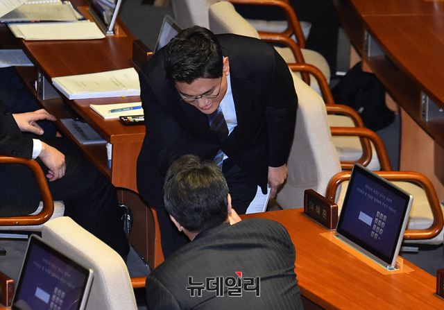 오신환 바른정당 원내대표가 5일 오후 국회에서 열린 본회의에서 비교섭단체 대표연설을 마치고 의원들과 인사를 나누고 있다.