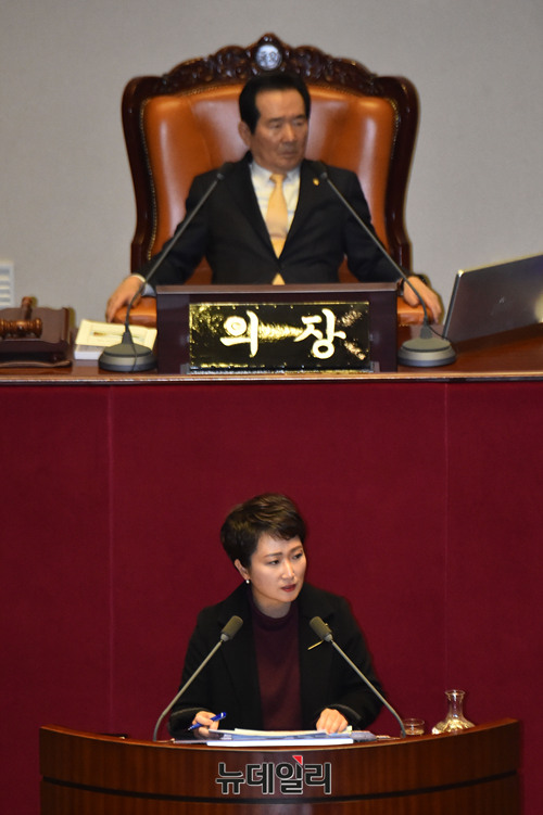 이언주 국민의당 의원이 5일 오후 국회에서 열린 본회의에서 정치-통일-외교-안보 분야 대정부질문을 하고 있다.