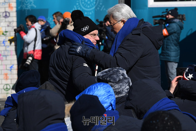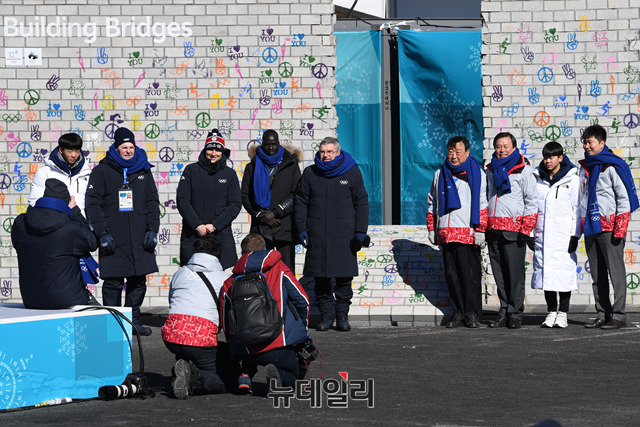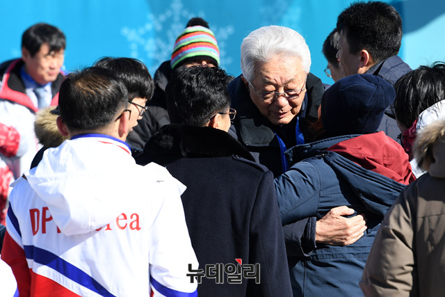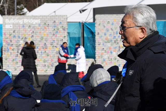 장웅 북한IOC위원이 평창동계올림픽이 나흘 앞으로 다가온 5일 오전 강원도 평창올림픽 선수촌에서 열린 휴전벽 제막행사에 참석해 휴전벽에 서명 직후 이동하고 있다. (사진=2018평창사진공동취재단)