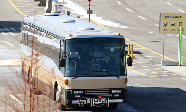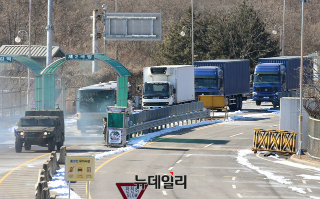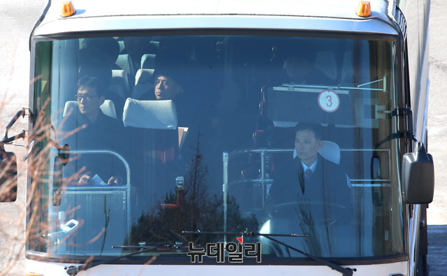 북한 삼지연관현악단의 특별공연 선발대를 태운 버스가 5일 오전 경의선 육로로 군사분계선(MDL)을 지나 우리 측 통문을 통과하고 있다. (사진=공동취재단)