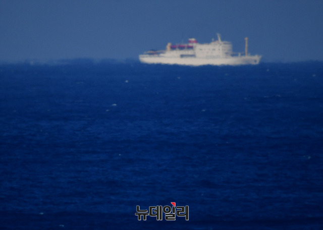 북한 예술단 본진을 태운 만경봉호가 6일 오후 강원 동해휴게소 전망대에서 육안으로 관찰되고 있다. 만경봉호는 오후 5시 동해 묵호항으로 입항할 예정이다. (강원 동해=뉴데일리 정상윤 기자)