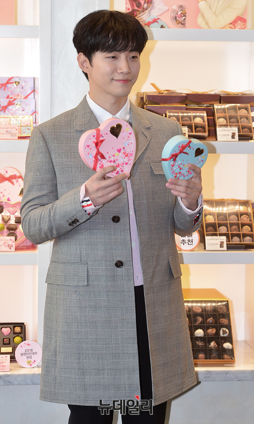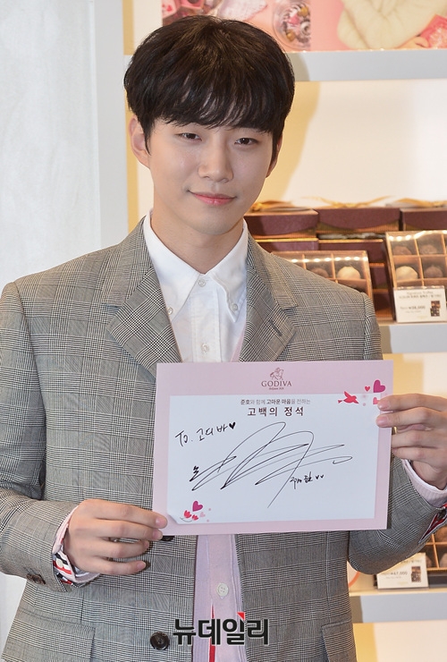 가수 준호가 6일 오후 서울 종로구 고디바 광화문점에서 열린 고디바(GODIVA) 2018 밸런타인데이 한정 초콜릿 '쥬얼리 컬렉션' 론칭 기념 행사에 참석해 사인을 들어 보이고 있다.