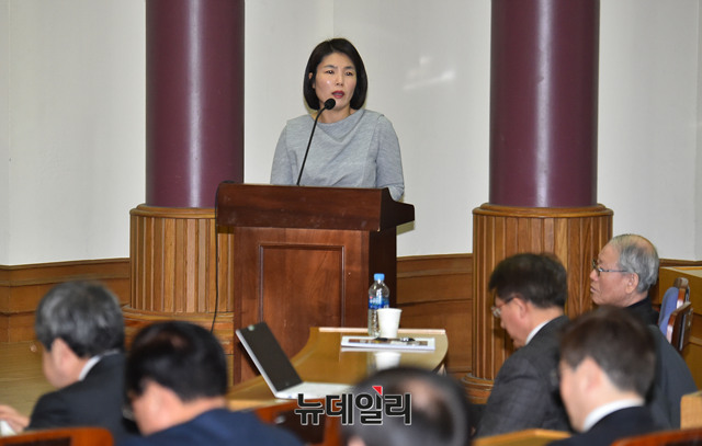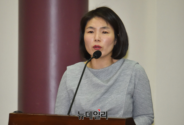 전희경 자유한국당 의원이 6일 국회의원회관에서 '2018 체제전쟁: 대한민국, 사회주의 호에 오르는가' 토론회에서 인사말을 하고 있다.