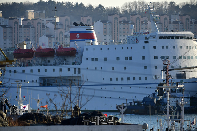 북한 삼지연관현악단 114명을 태운 만경봉 92호가 6일 오후 강원 동해시 묵호항에 접안중이다. 선미 부분에 달린 인공기가 휘날리고 있다. 만경봉호는 오늘 새벽 북한 원산항을 출발해 오후 5시께 동해시 묵호항으로 도착했다.만경봉호는 2002년 부산 아시안 게임 때도 응원단을 싣고 감천항에 정박해 숙소로 사용됐던 배다. 정부는 평창 동계올림픽의 성공적 개최를 지원한다는 차원에서 5.24조치 예외 조치로 적용했다.5.24 조치는 천안함 폭침 사건에 대한 대응으로 대한민국 정부가 2010년 발표한 대북 제재 조치로 북한 선박의 남측 해역 운항을 전면 불허, 남북 교역 중단, 국민의 방북 불허, 대북 신규 투자 금지, 대북 지원사업의 원칙적 보류 등을 담고 있다. (강원 동해=뉴데일리 정상윤 기자)