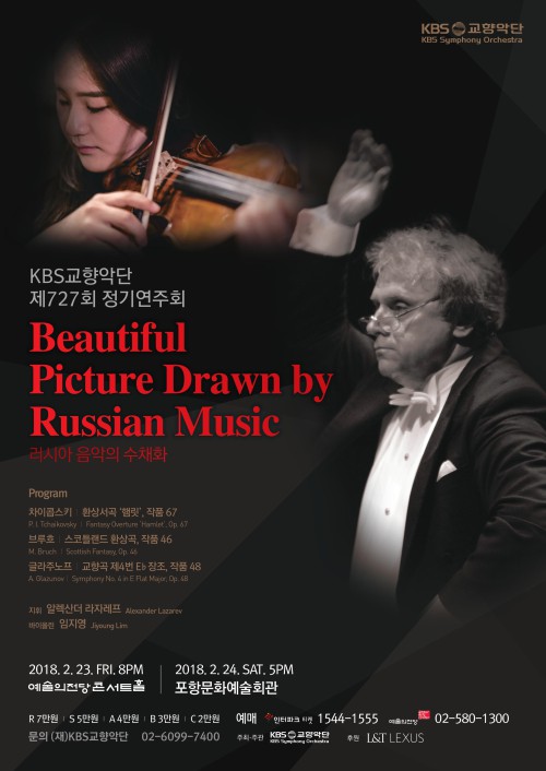 러시아의 대표 지휘자 알렉산더 라자레프(73)와 바이올리니스트 임지영(23)이 KBS교향악단과 협연한다.KBS교향악단은 오는 23일 오후 8시 예술의전당 콘서트홀, 24일 5시 포항문화예술회관에서 '러시아 음악의 수채화'라는 주제로 '제727회 정기연주회'를 연다.이번 정기연주회는 2010년 이후 오랜만에 단원들과 호흡을 맞추는 알렉산더 라자레프의 음악 세계를 고스란히 느낄 수 있는 프로그램으로 선곡됐다.라자레프는 1972년 베를린에서 개최된 헤르베르트 폰 카라얀 국제 지휘 콩쿠르에서 1등을 받았고, 이후 볼쇼이극장의 상임 지휘자와 BBC심포니, 로열 스코티시 국립교향악단 수석 객원지휘자를 역임했다. 현재 재팬 필하모닉 오케스트라의 명예지휘자로 활동하고 있다.1부에서는 러시아 작곡가 차이콥스키 환상 서곡 '햄릿', 2부에서는 글라주노프의 교향곡 4번이 연주된다. 글라주노프의 교향곡 4번은 음악적 구성이 뛰어나고 다이나믹이 화려한 작품임에도 한국에서는 자주 연주되지 않는 곡이다.퀸 엘리자베스 국제 콩쿠르에서 우승한 바이올리니스트 임지영은 브루흐의 '스코틀랜드 환상곡'을 들려준다. 이 곡은 스코틀랜드의 민요에서 유래한 영감과 그리움의 정서를 토대로 자유로운 형식을 취하고 있다.관람료 2만~7만원. 문의 02-6099-7400.[사진=KBS교향악단]