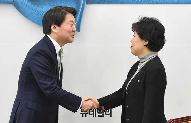 안철수 국민의당 대표가 7일 오전 국회 당 대표실에서 조배숙 민주평화당 대표를 만나 인사를 하고 있다.