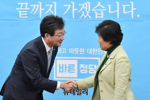 유승민 바른정당 대표가 7일 오후 국회 당대표실을 방문한 조배숙 민주평화당 대표와 악수를 나누고 있다.