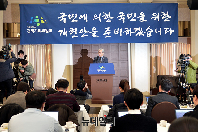 정해구 대통령 직속 정책기획위원장이 7일 오후 한국프레스센터에서 '대통령 발의 개헌안' 준비와 관련해 질문에 답하고 있다.