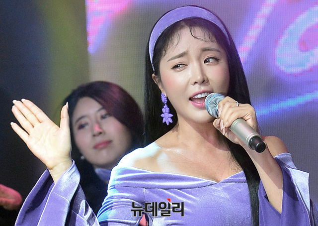 가수 홍진영이 7일 오후 서울 마포구 무브홀에서 열린 싱글앨범 '잘가라' 발매 기념 쇼케이스에 참석해 신곡을 선보이고 있다.