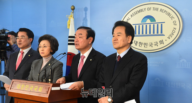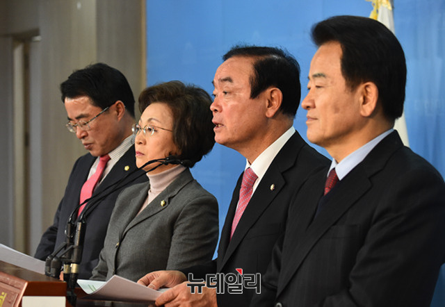 장병완 민주평화당 원내대표, 정동영, 장정숙 최경환 의원이 8일 오후 국회 정론관에서 당 1호 법안 및 중점추진법안 기자회견을 하고 있다.