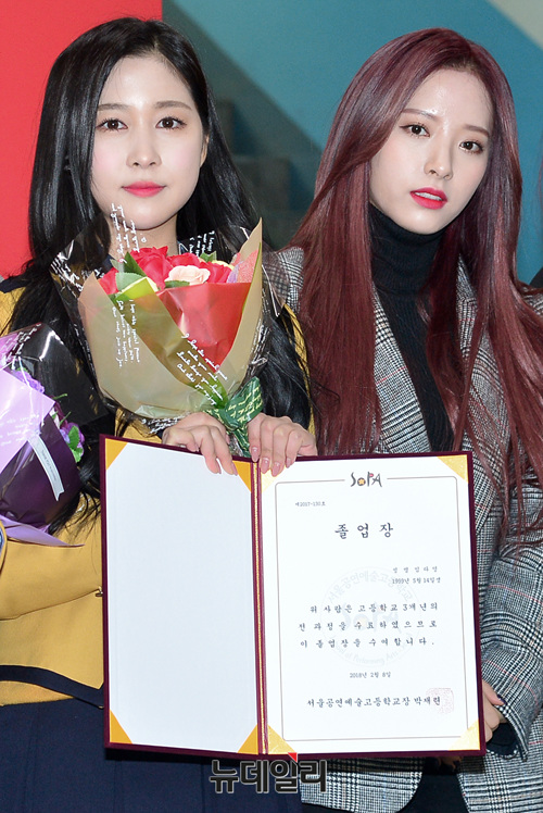 그룹 우주소녀(설아, 엑시, 보나, 성소, 은서, 다영, 다원, 수빈, 선의, 여름, 미기, 루다, 연정)가 8일 오전 서울 구로구 서울공연예술고등학교에서 열린 멤버 여름, 다영 졸업식에 참석해 포즈를 취하고 있다.