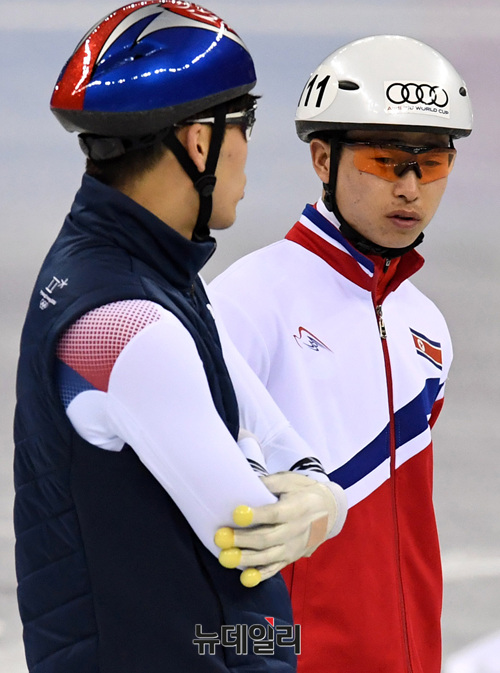 [포토] 대화 나누는 남북 쇼트트랙 대표팀