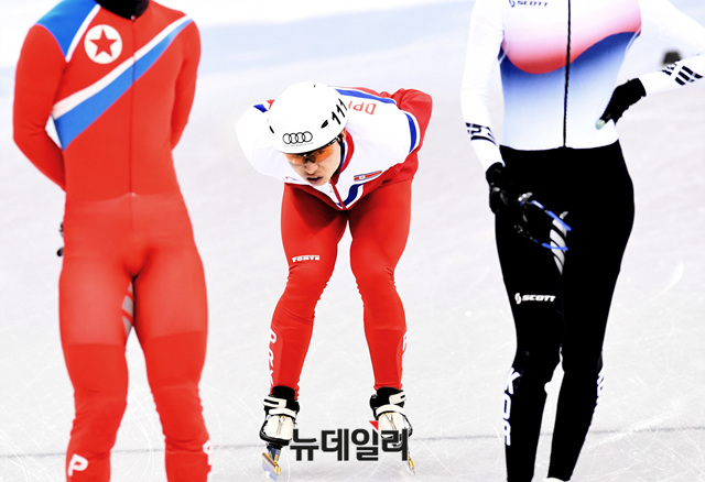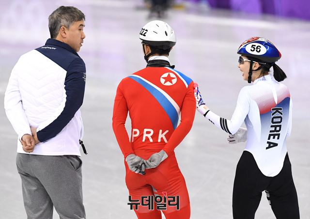 2018 평창동계올림픽에 출전하는 남북 쇼트트랙 대표팀이 8일 오후 강원도 강릉아이스아레나에서 훈련 중 대화를 나누고 있다. (사진=2018평창사진공동취재단)