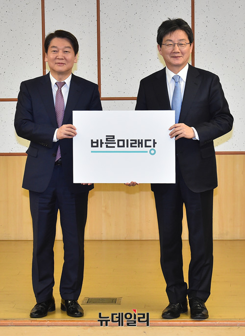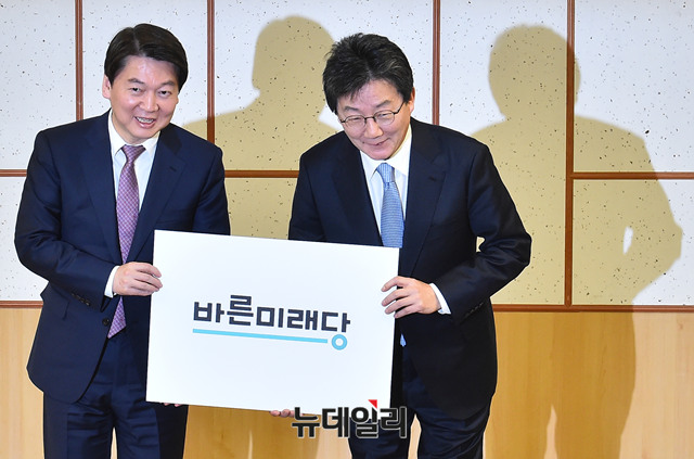 국민의당 안철수, 바른정당 유승민 대표가 9일 오후 국회 의원회관에서 열린 국민의당-바른정당 합동 통합추진위원회 제5차 전체회의에 참석해 바른미래당 CI를 공개하고 있다.