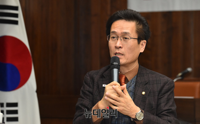 함진규 자유한국당 정책위의장이 9일 오후 국회 도서관 소회의실에서 열린 '국민이 진정으로 원하는 개헌은?' 전문가와 함께하는 개헌 대토론회에 참석해 축사하고 있다.