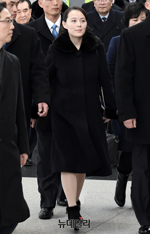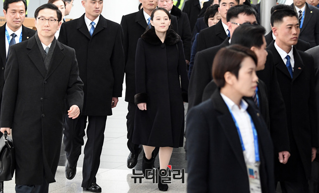 북한 김정은의 여동생 김여정이 9일 오후 전용기를 통해 인천국제공항 제1여객터미널에 도착 후 KTX 승차장으로 이동하고 있다.