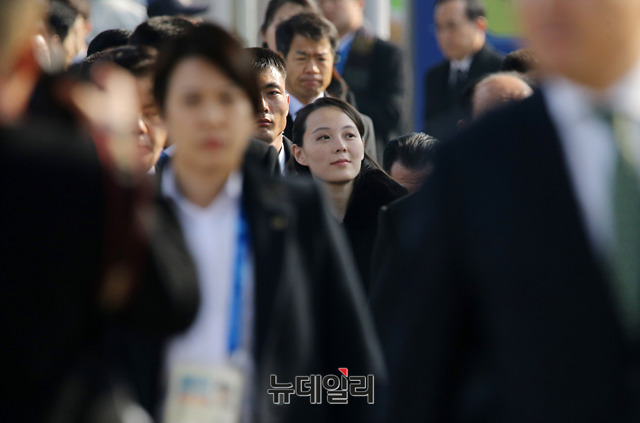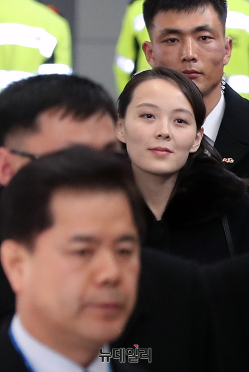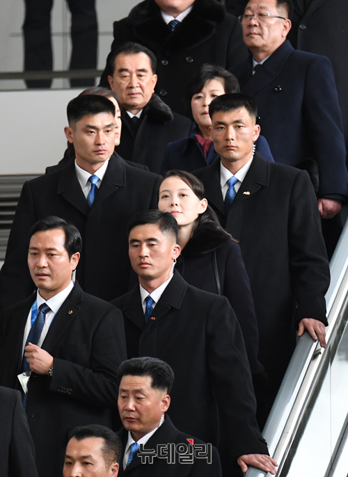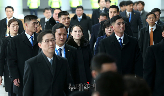 김정일의 딸 북한 김여정이 9일 오후 전용기를 통해 인천국제공항 제1여객터미널에 도착한 직후 KTX를 타기위해 이동하고 있다. 김여정은 일행을 마중 나온 조명균 통일부 장관과 환담 후 평창동계올림픽 개막식에 참석하기 위해 KTX로 평창으로 이동했다. (인천=뉴데일리 공준표 기자)