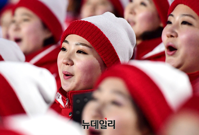 북한응원단이 9일 오후 강원도 평창군 올림픽스타디움에서 열린 '2018 평창동계올림픽' 개막식에서 인공기를 흔들며 응원하고 있다.
