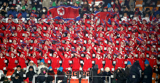 [포토] 올림픽개막, 인공기 흔드는 北응원단