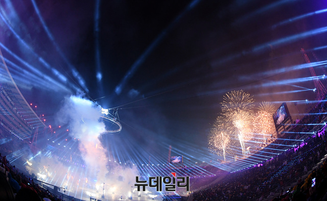 2018 평창동계올림픽 개막을 알리는 불꽃이 9일 오후 강원도 평창군 올림픽스타디움에서 펼쳐지고 있다.