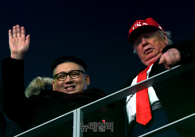 도널드 트럼프 미국 대통령과 북한 김정은을 코스프레한 관람객이 9일 오후 강원도 평창군 올림픽스타디움에서 열린 '2018 평창동계올림픽' 개막식에서 포즈를 취하고 있다.