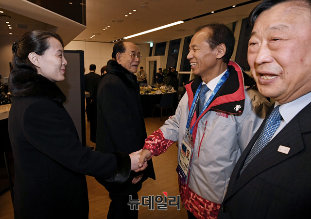 이희범 평창올림픽 조직위원장과 북한 김정은의 여동생 김여정이 10일 오후 강원도 강릉시 스카이베이 경포호텔에서 열린 통일부 주최 만찬에서 악수를 나누고 있다.