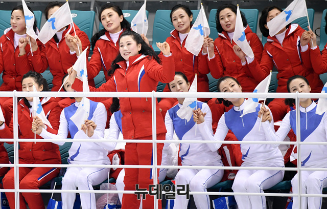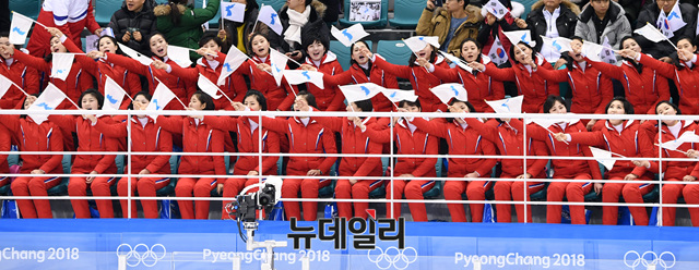 북한응원단이 10일 오후 강릉 관동하키센터에서 열린 여자 아이스하키 남북단일팀과 스위스의 경기에 참석해 한반도기를 흔들고 있다.
