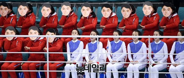 북한응원단이 지난 10일 오후 강릉 관동하키센터에서 열린 여자 아이스하키 남북단일팀과 스위스의 경기에 참석해 가면을 쓰고 응원하고 있다.
