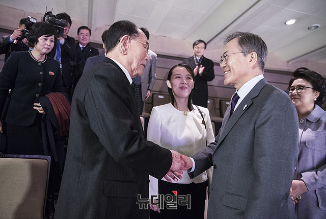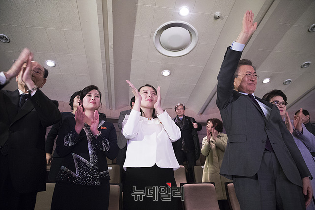 문재인 대통령 내외가 11일 오후 서울 중구 국립중앙극장에서 김영남 최고인민회의 상임위원장, 김여정 노동당 중앙위원회 제1부부장, 현송월 단장과 함께 북한 예술단의 공연을 관람하고 있다. (사진=청와대)