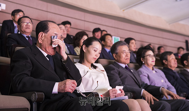 북한 김영남이 11일 오후 서울 중구 국립중앙극장에서 북한 예술단의 공연을 관람하며 눈물을 닦고 있다. (사진=청와대)
