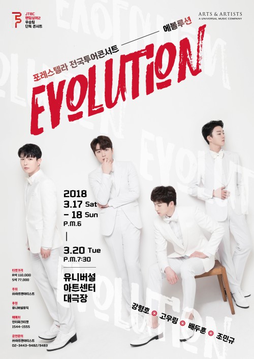 '팬텀싱어2' 우승팀인 포레스텔라가 오는 3월 데뷔 음반 발매와 함께 첫 번째 전국투어 콘서트를 개최한다.초대 우승팀인 포르테 디 콰트로의 바통을 이어받은 포레스텔라는 '숲(forest)위에 뜬 별(stella)'이라는 의미를 가진다. 뮤지컬 배우 배두훈, 테너 조민규, 베이스 고우림, 화학회사 연구원 강형호 등 4인으로 구성됐다.JTBC '팬텀싱어'는 '한국판 일 디보' 프로젝트로 크로스오버 남성 4중창을 선발하는 오디션 프로그램이다.멤버들은 경연 내내 과감한 선곡과 안정적인 실력으로 서정성 짙은 크로스오버 곡에세 탱고, 록 음악 등에 이르기까지 개성 넘치는 곡을 소화하며 탁월한 전략과 강한 카리스마를 보여준 바 있다.포레스텔라의 이번 공연 제목은 데뷔 음반과 동명의 타이틀인 '에볼루션(EVOLUTION)'이다. 크로스오버 음악의 고정관념을 깨고 다양한 색깔로 한층 진화한 세련된 음악의 정수를 들려줄 예정이다.전국투어 콘서트는 3월 9일 고양을 시작으로 군포, 서울, 안성, 부산, 익산, 대전, 성남, 구미 등 9개 도시가 예정돼 있다.[사진=아트앤아티스트]