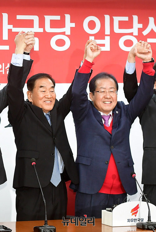 홍준표 자유한국당 대표와 이재오 늘푸른한국당 대표가 12일 오전 서울 여의도 당사에서 열린 늘푸른한국당의 자유한국당 입당식에서 손을 맞잡고 있다.