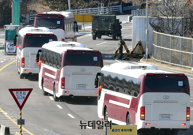 북한 삼지연관현악단 137명이 12일 오전 경기 파주 도라산 남북출입사무소(CIQ)를 통해 북한으로 돌아가고 있다.