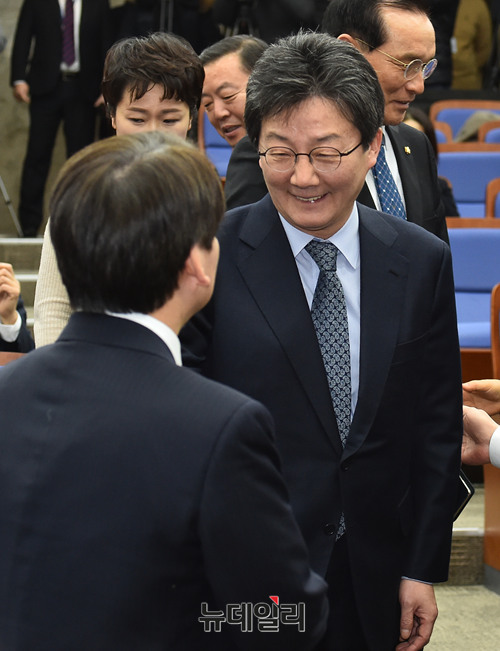 안철수 국민의당 대표와 유승민 바른정당 대표가 12일 오후 국회에서 열린 바른미래당 추진위원회 국회의원 합동 연석회의에서 인사를 나누고 있다.