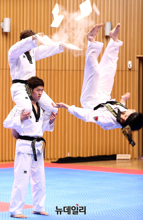 북한이 주도하는 국제태권도연맹(ITF) 태권도 시범단이 12일 오후 서울시청에서 열린 '남북 태권도 합동 시범 공연'에서 격파 시범을 보이고 있다. (사진=공동취재단)