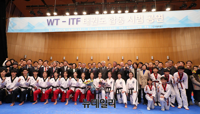 박원순 서울시장이 12일 오후 서울시청에서 열린 '남북 태권도 합동 시범 공연'에 참석해 북한 시범단과 악수를 나누고 있다. (사진=공동취재단)
