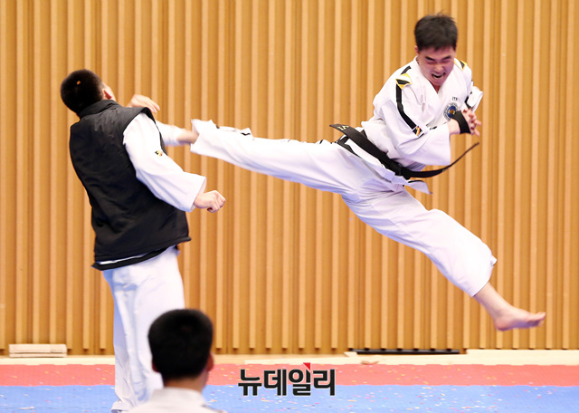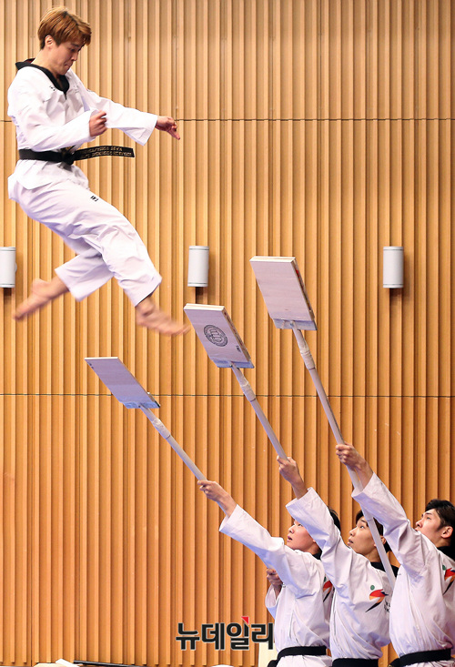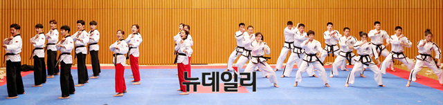 세계태권도연맹(WT)과 북한이 주도하는 국제태권도연맹(ITF) 태권도 시범단이 12일 오후 서울시청에서 열린 '남북 태권도 합동 시범 공연'에서 인사를 나누고 있다. (사진=공동취재단)